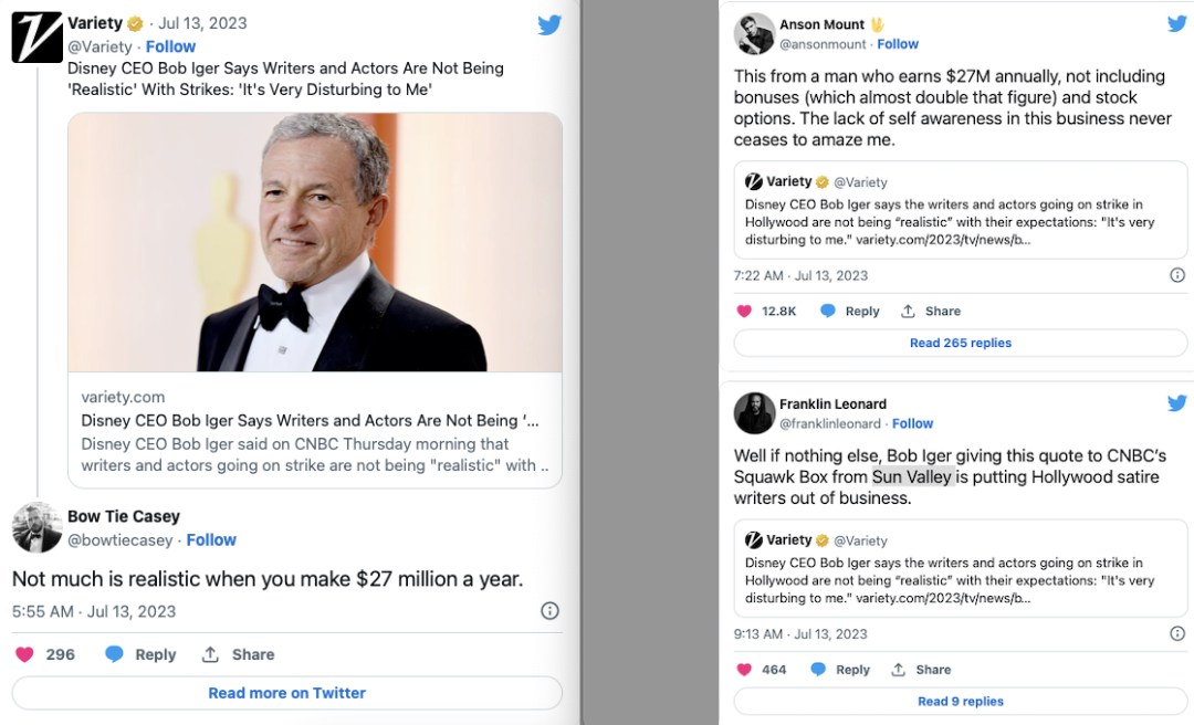 更让艾格尔成为话题焦点的是上周的好莱坞罢工事件。由于无法就薪酬福利等问题达成一致,好莱坞演员与编剧工会正在联合进行大罢工。而迪士尼等制片方的立场同样强硬,不愿继续做出让步。有消息称,资方甚至准备耗到秋天,让编剧演员们弹尽粮绝,不得不接受资方的条件,从而彻底压垮劳资谈判。