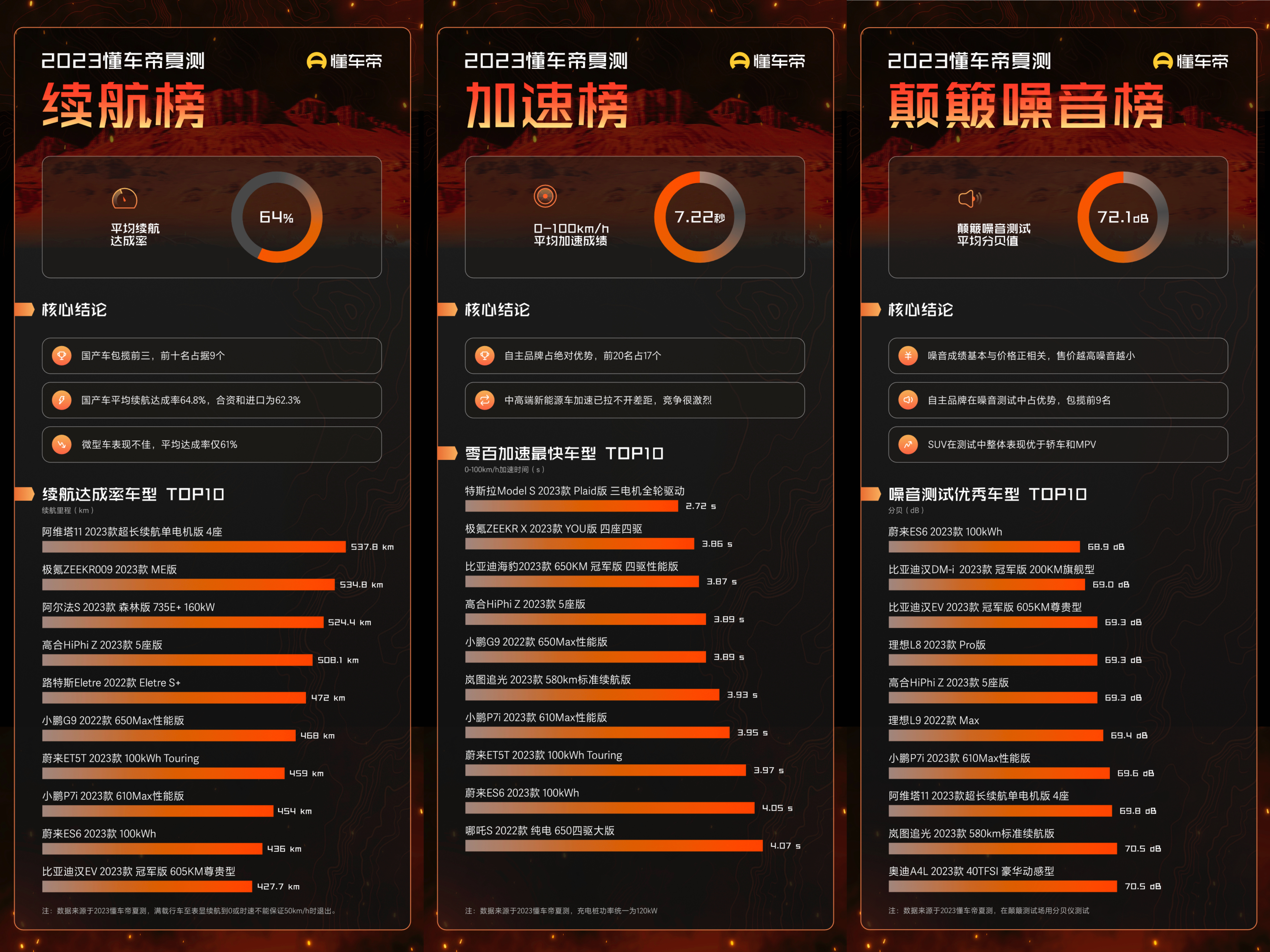 结果显示,国产新能源车型在高温满载续航、高温加速测试等多项测试结果中领先。40°C以上高温天气下,新能源车满载平均续航达成率为64%,续航里程前10车型中,国产品占据9个。同时,国产车型在加速性能、隔音效果、车机智能化水平等也占据一定优势,具有较高产品力。