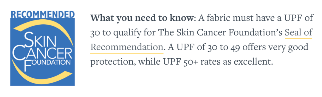 有些防晒衣在宣传的时候会说“获得皮肤癌基金会的推荐”,这个听起来很厉害,不过从美国皮肤癌症基金会的官网可以看到,衣物 UPF 值达到 30时, 即可获得这块蓝色小图标[13]。