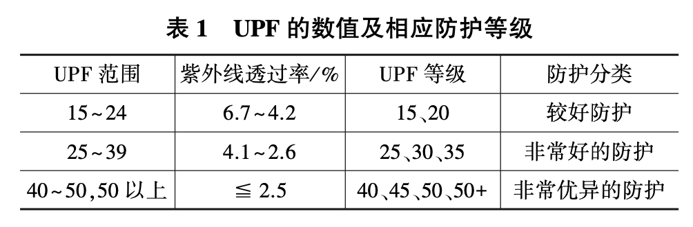 国家标准规定的 UPF 防护等级 / 李雪杰,冯爱芬. (2016). 防晒衣面料的功能性和服用性能研究[J]. 上海纺织科技,44(8):53-56.