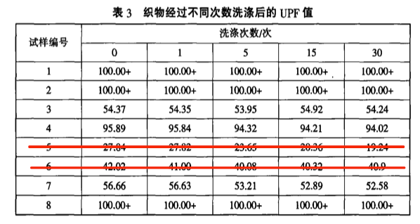 编号 5、6 为不合格产品;其他为水洗 0 至 30 次 UPF 值的变化 / 孟花, 祖倚丹, 侯东昱, et al. (2022). 针织防晒衣面料防紫外线和热湿舒适性研究[J]. 针织工业,2:17-21. DOI:10.3969/j.issn.1000-4033.2022.02.005.