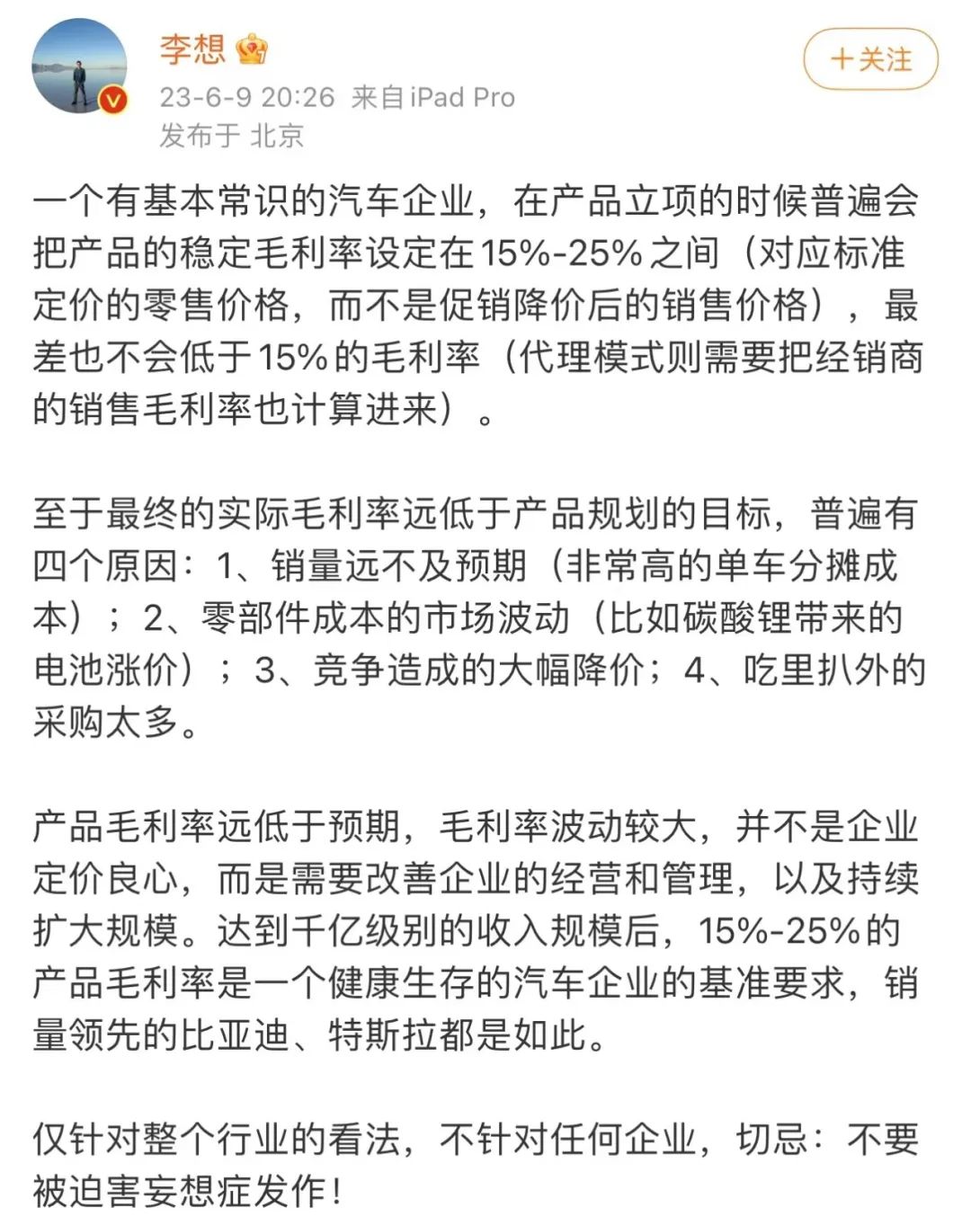 今年6月,就在李斌为净亏损47.4 亿元、毛利率跌至1.5%的财报发愁时,另一边李想却不紧不慢地点评起了汽车毛利率。
