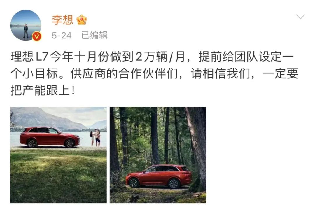 就在蔚来发布会当晚,李想发布微博称,“理想L7今年十月份做到2万辆/月,提前给团队设定一个小目标。”