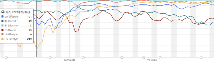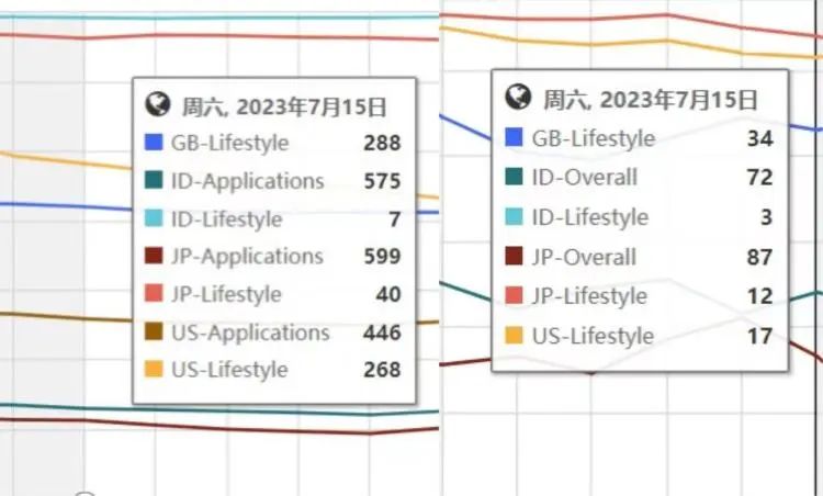 对比7月15日Lemon8四个国家生活方式应用的排名情况(Google Play),印尼市场排名最高,日本市场其次。反观同一天App Store的情况,排名先后相同,但在生活方式应用的位次均排在前50名。显然,iOS用户消费力更高、更喜欢精致生活的“刻板印象”再次生效。