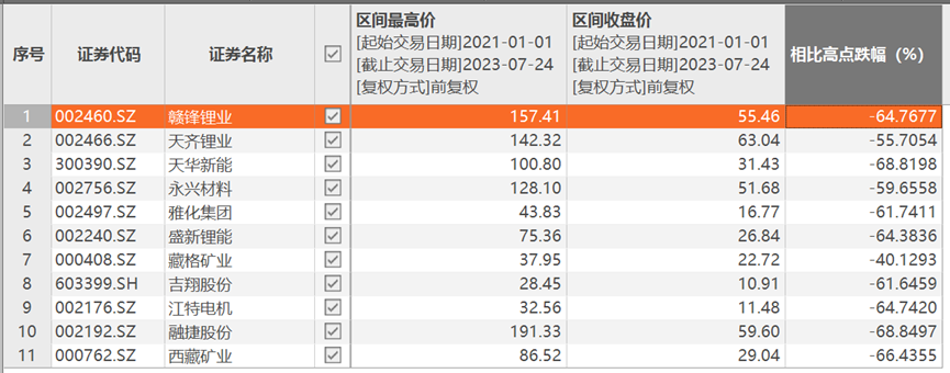 截至7月24日,A股11家锂业上市公司中,有8家股价(前复权)距离前期高位已跌超过60%。其中,赣锋锂业由157.41元跌至55.46元,跌幅64.77%;天齐锂业由142.32元跌至63.04元,跌幅55.71%。