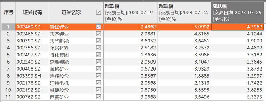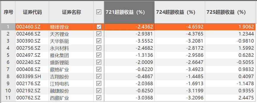 计算得出的数据同样悲观,以“锂业双雄”赣锋锂业和天齐锂业为例,赣锋锂业在7月21日和24日的超额收益分别为-2.44%和-4.66%,但7月25日的超额收益只有1.9%;天齐锂业在7月21日和24日的超额收益分别为-2.94%和-4.38%,但7月25日的超额收益只有1.23%。