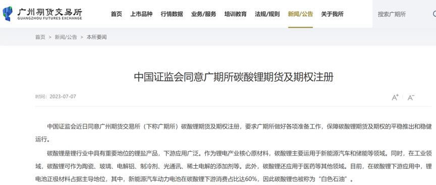 中国的碳酸锂期货在广期所上市。7月7日,广期所官网显示:“中国证监会同意广期所碳酸锂期货及期权注册,要求广期所做好各项准备工作,保障碳酸锂期货及期权的平稳推出和稳健运行。”