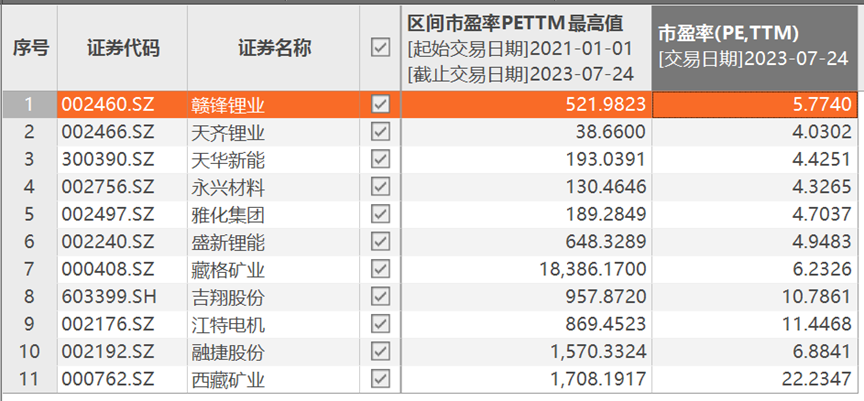 依旧是截至7月24日,头部锂业公司的市盈率(TTM)都在个位数水平,赣锋锂业和天齐锂业分别为5.78倍和4.03倍;而近年来,它们市盈率(TTM)最高分别达到522倍和38.7倍。
