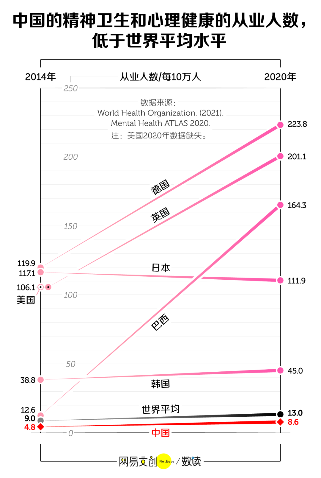 而中国每 10 万人只有 8.6 名精神卫生和心理健康从业人员,仅达到世界平均水平的六成左右 [10]。