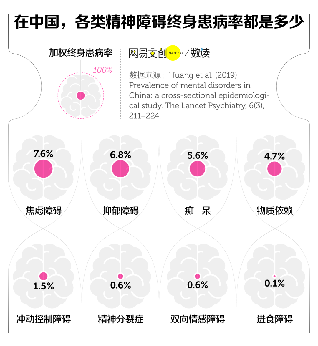 2019 年,由北大六院的黄悦勤教授组织的中国精神卫生调查结果发表在《柳叶刀·精神病学》。调查发现,中国成年人各类精神障碍(不包括痴呆)的加权终生患病率为 16.6% [6]。