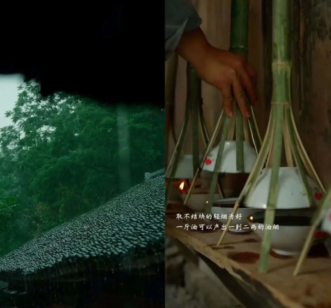 取够大漆后,“山白”开始混合桐油、猪油,倒到一个个大碗中,引灯芯点燃,然后炼烟、取烟。这个过程极考验耐心,因为1斤油只能产出1-2两的油烟。