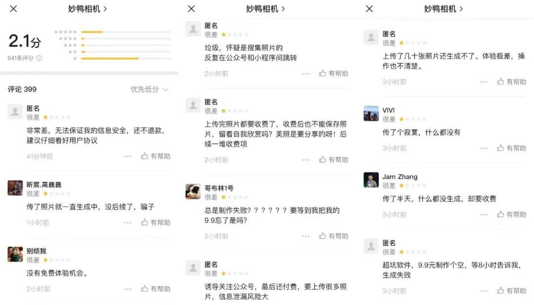 目前妙鸭相机小程序的评分仅有2.1分,大量用户留言差评。其中,等待时间过长、对效果不满意占了80%以上,同时还有部分用户抗议,表示妙鸭相机无法退款。