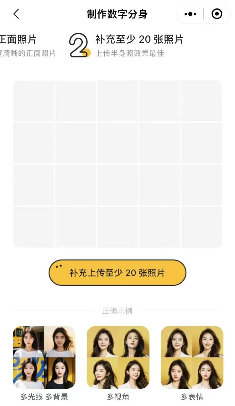 打开妙鸭相机制作“数字分身”,第一步需要上传正脸照,这也是制作写真照片的母版。完成第一步后,需要再补充20张不同角度、不同光线的自拍照,用以辅助生成。需要如此多的照片对不少用户是一个挑战。