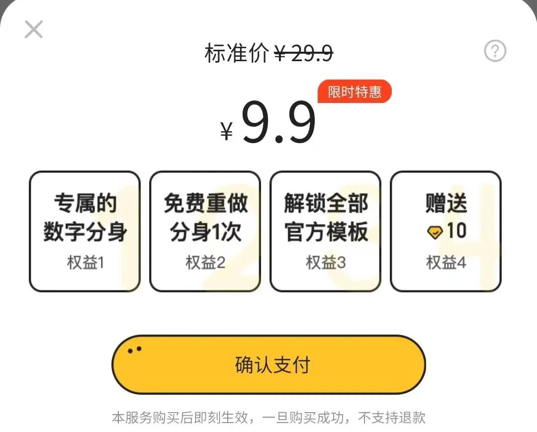 等到第二步完成,妙鸭就开始收费:标准价29.9,限时特惠9.9元。等到付款完成后,才可以继续生成“数字分身”。