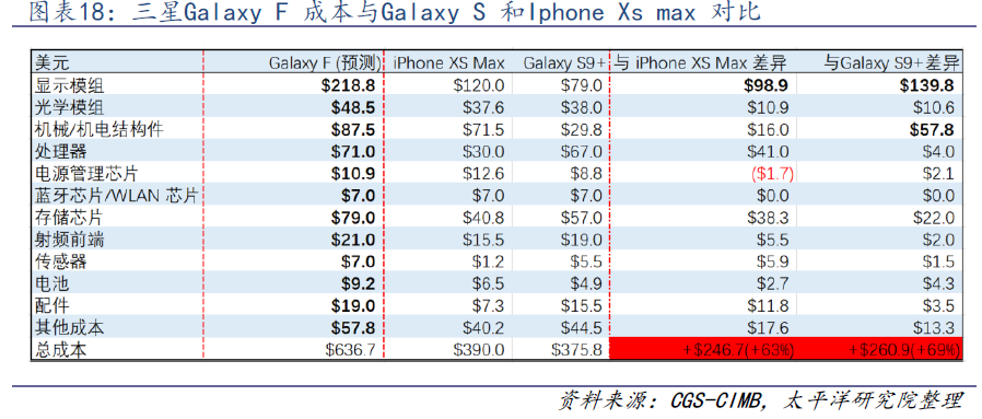 这些零部件是折叠屏手机有别于直板机的特有组成部分。对应部分,可以通过三星第一款折叠屏手机(Galaxy Fold)对比同代旗舰(Galaxy S9+)BOM成本变化中看出。其中,机械/机电结构件、显示模组和电池的成本激增。细化到具体零件上,折叠屏手机的核心零部件是铰链、电池和柔性屏。