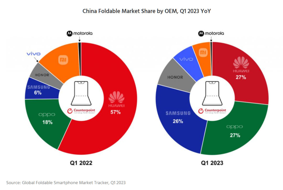 在多家厂商的竞争之下,中国折叠屏市场竞争格局从华为占据半边江山,转变为多强争霸格局,后发厂商“逆袭”趋势明显。