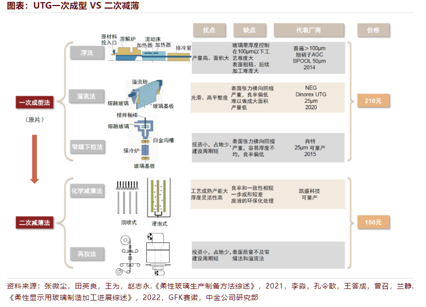 UTG生产工艺可以分为一次成型和二次减薄两种方法。其中,一次成型法可以分为浮法、溢流法和窄缝下拉法,直接将玻璃原料加工成盖板。技术难度大,但是生产成本低,产品良率高。技术主要被康宁、日本电气硝子、德国肖特、旭硝子掌握。