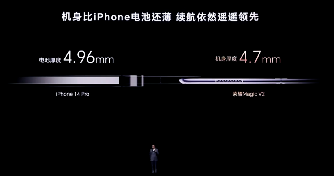 当下,荣耀在折叠屏手机中也引入了硅碳负极电池(青海湖电池)。Magic V2(素皮版)的电池容量相对前代虽未提升(保持5000mAh不变),但将电池厚度削减到2.7毫米。手机展开厚度削减到了4.7毫米,比iPhone电池厚度还薄。