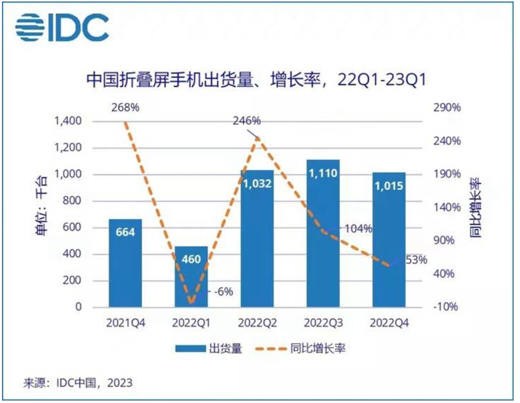 2023年第一季度,中国智能手机市场出货量约6544万台,同比下降11.8%。但国产折叠屏产品出货量逆势上扬,出货量达到102万台,同比增长52.8%,并且预计未来增长劲头强劲。