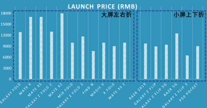 根据Canalys数据,全球折叠屏手机平均售价从2019年的2000美元以上下降到2021年的1500美元左右。随后,国内厂商的产品定价进一步下调,大部分首发售价已进入万元以内。折叠屏手机代际价格中枢下移趋势明显。