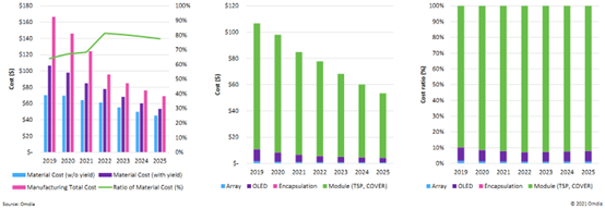 成本端,折叠屏手机制造成本下探明显。由于每个厂商较少特别说明配件价格,我们选择作为折叠手机核心零部件的柔性屏作为参照系。参考Omdia 在2021年6月对7.6英寸屏幕的分析显示,屏幕模组在2021-2025年价格预计将从124.21美元下降至68.98美元。