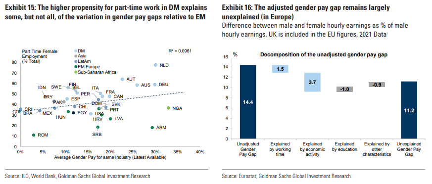 根据国际劳工组织的数据,发达市场女性的收入差距中位数为23%,而新兴市场女性的收入差距中位数为18%。也就是说,发达市场女性的收入差距更高,尽管这一市场的劳动力参与率也更高。这种差异可能是由于发达市场的女性更倾向于兼职工作。