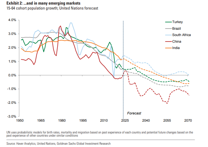 15年前,我们的研究集中在“人口转型”的积极方面。 当时是生育率下降造成的影响: 儿童数量减少,但适龄工作人口的大量增长对许多新兴市场来说是一个福音。 然而,这个窗口期现在也基本上关闭了。 此外,劳动年龄人口的减少将因其他问题而加剧,其中包括地缘政治风险和许多发达市场存在养老金融资问题。