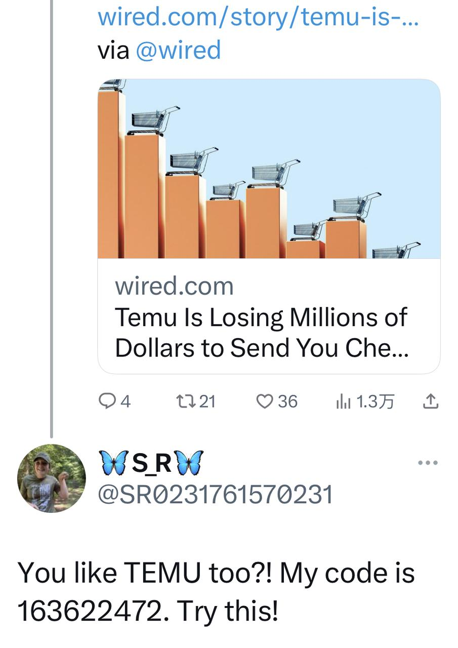 从营销手法来看,国内有横扫微信聊天框的“砍一刀”,美国则有席卷Twitter评论区的“Code for code”(交换促销码获得折扣)。甚至是在5月,《连线》杂志在Twitter上发表了一篇Temu供应链的调查文章里,评论区里都是不看正文就热情分享Code的美国老铁。