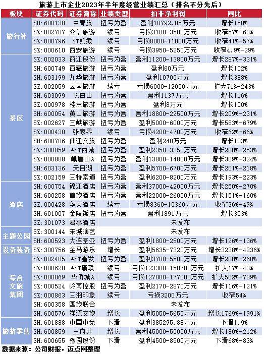 值得一提的是,上述33家企业对比一季报,中报盈利数量显著增加,由19家提升至24家,新增长白山、桂林旅游、西藏旅游、*ST西域和中青旅五家企业。财报数据显示,上述五家企业第二季度扣非净利润环比增速分别达到356%、201%、106%、375%-450%、1561%。