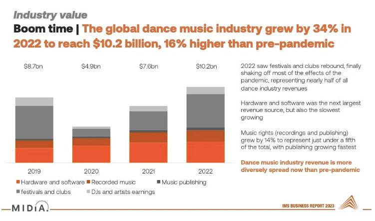 据国际音乐峰会(IMS)数据显示,2022年全球电音市场价值增长了34%。应该说,在年轻群体中,电音与说唱占据了很大一部分耳朵,这对于电音文化的推广是极其有利的。