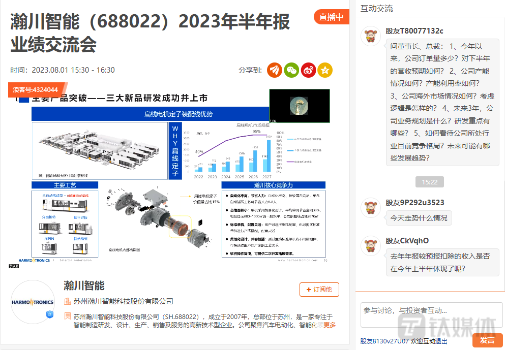 关于下半年展望,瀚川智能董事长蔡昌蔚在业绩交流会上表示,下半年公司主要工作重点是市场开拓,尤其是东南亚与墨西哥的海外市场开拓;其次是提高经营效益,包括内部的降本增效;第三是优化产品组合,筛选出最优质的产品线加大投入。