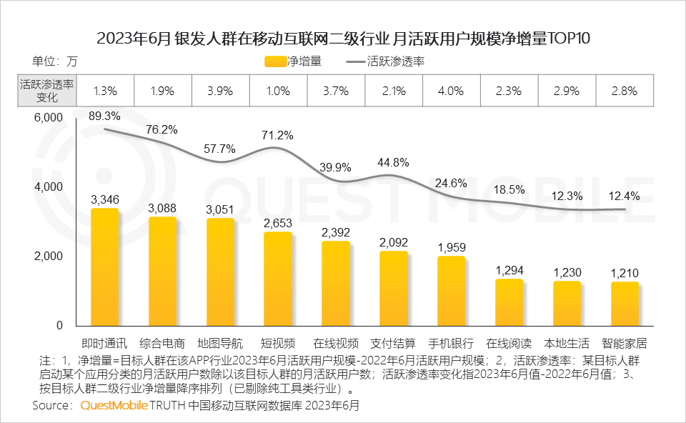 银发群体作为移动互联网重要增量来源,仍处在线上应用快速渗透的阶段,这个群体中,即时通讯、综合电商、短视频、地图导航、支付结算等领域活跃渗透率分别达到89.3%、76.2%、71.2%、57.7%、44.8%。