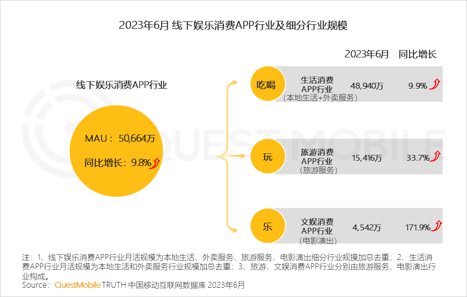 2.1 线下娱乐消费APP行业由生活消费、旅游消费、文娱消费APP行业构成,而随着居民消费升级,带动以上行业月活规模同比均实现增长