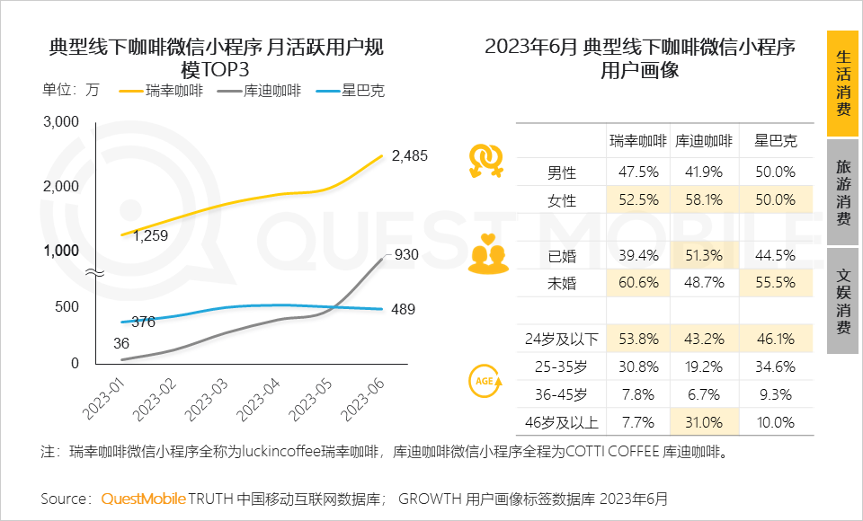 2.6 典型线下咖啡品牌通过微信小程序承接更多的流量,其中以24岁以下女性群体为主;瑞幸、星巴克小程序以未婚群体为主,而库迪以已婚群体为主,此外其46岁及以上群体占比较高