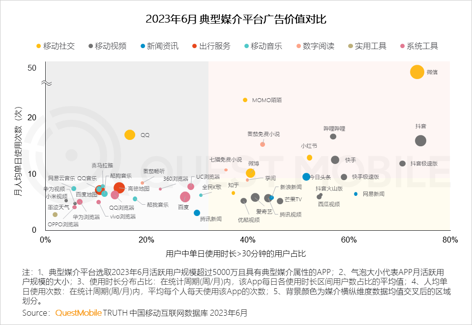 2.3 从用户行为看媒介价值,用户高频使用和高时长停留为广告主提供了更多的曝光机会,也赋予了对应媒介更高的营销价值
