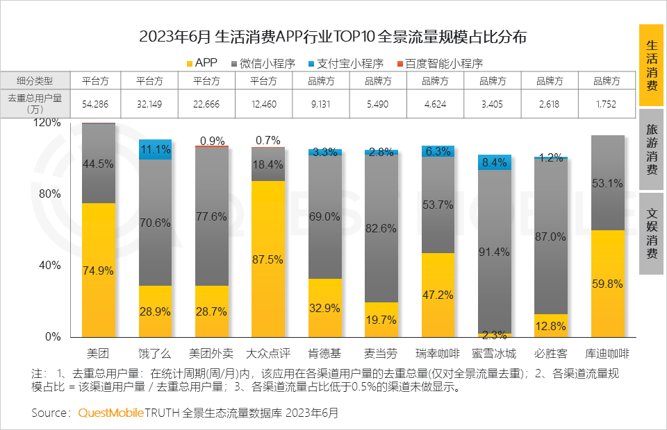 2.2 生活消费行业全景流量TOP10应用,以“APP+小程序”多渠道布局,覆盖多元场景,实现流量汇聚