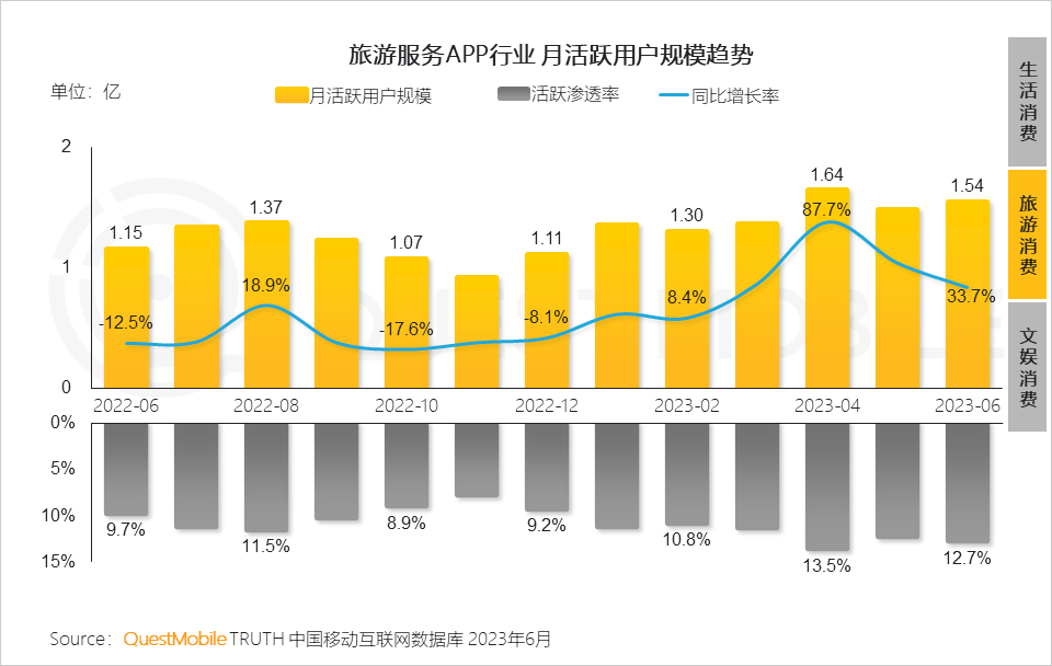 2.8 2023年上半年,我国旅游市场持续恢复,居民旅游出行需求大量释放,旅游服务行业规模增长,其中6月活跃用户规模达1.54亿,增幅33.7%