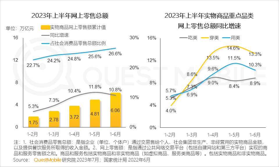 受618大促等因素刺激影响,全年实物网上零售累计突破6.06万亿元,增长表现突出,达到10.8%;细分看,吃、穿、用类商品的线上销售,均得以明显提升。
