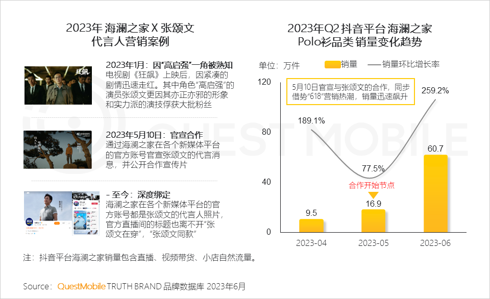 如海澜之家选择因2023年新剧《狂飙》走红的张颂文为代言人,代言人具有“大器晚成”色彩,收获各路网友喜爱,与品牌覆盖面广、低调有实力的形象相契合。
