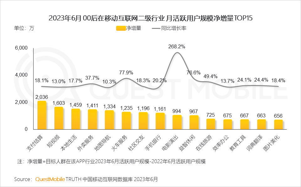 这背后,不同群体的表现差异很大:年轻群体(00后为代表)率先带动线下旅游、文娱等潮玩活动复苏,电影演出、火车服务、益智休闲、在线旅游等领域,00后用户群体月度活跃规模同比增长268.2%、77.9%、76.6%、49.4%,以典型演出类APP大麦为例,新增用户中00后占比达41%。