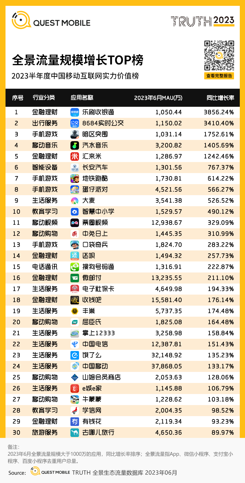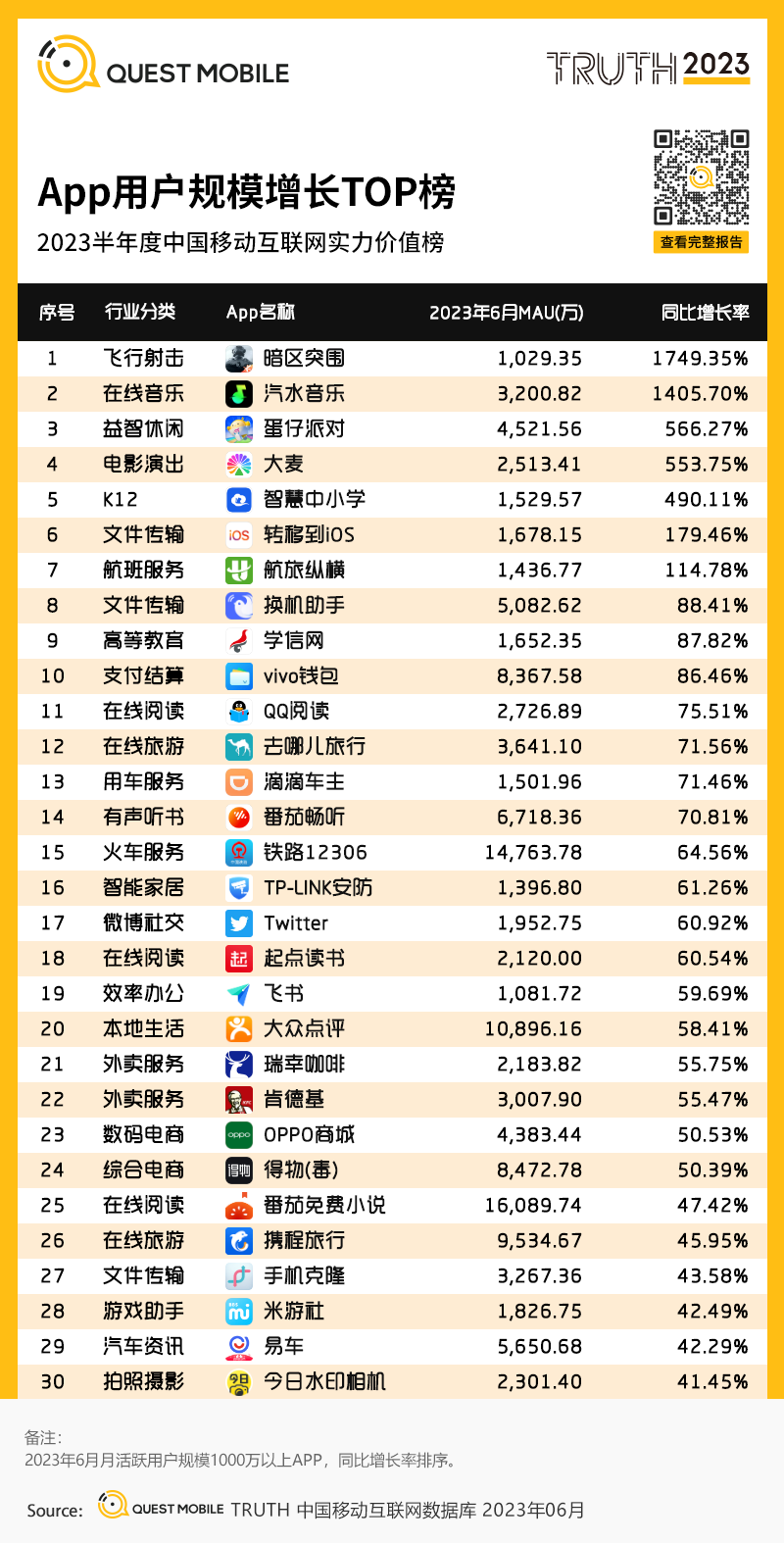 QuestMobile数据显示,2023年6月电影演出行业同比增长最为显著,达172%;航班、火车出行行业同比增速超50%,酒店服务、在线旅游等旅游行业同比增速超35%,复苏态势显著;智能汽车、智能配件行业同比增速超40%;另外有声听书、健康管理、手机游戏部分细分行业同比也呈现较高增长。