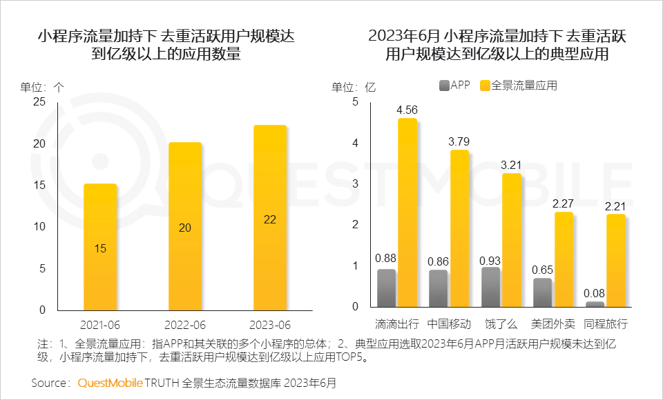 2.1 小程序流量正在帮助更多应用实现用户规模的提升QuestMobile数据显示,在APP端没有达到亿级,但在小程序流量加持下实现亿级突破的应用逐年递增,截止2023年6月,已有22款应用实现亿级流量的突破。