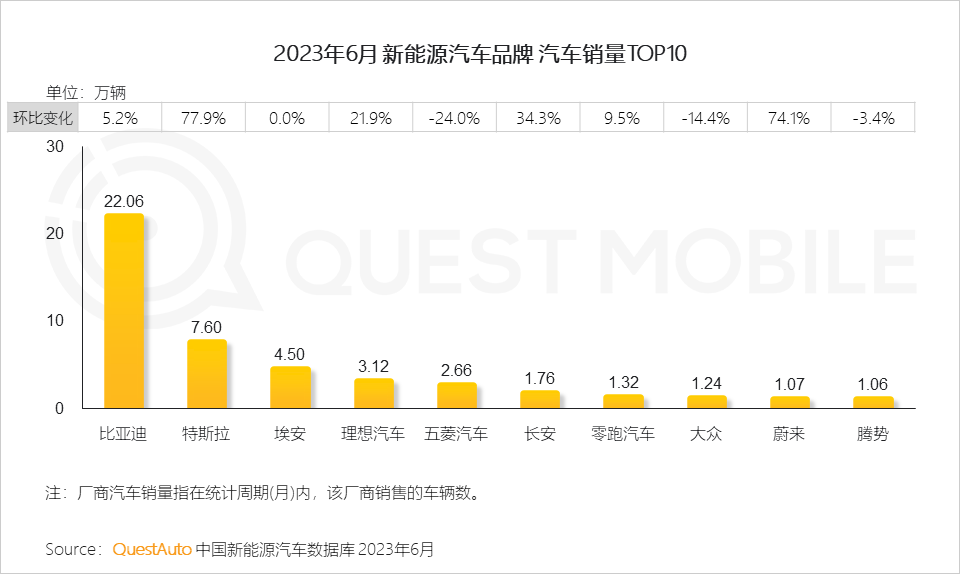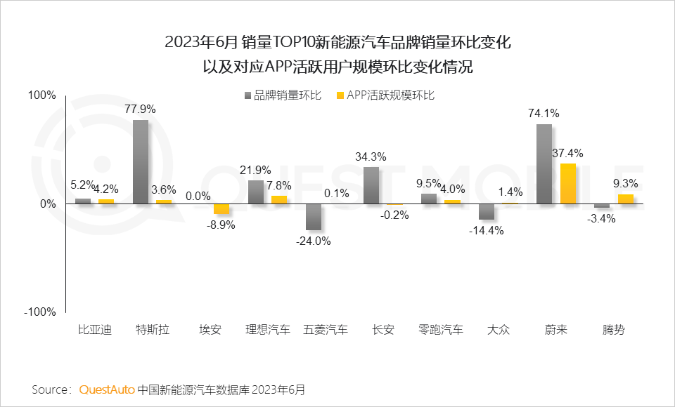 根据QuestAuto的数据显示,2023年6月,特斯拉、蔚来销量环比变化超过70%,较5月销量增长明显。