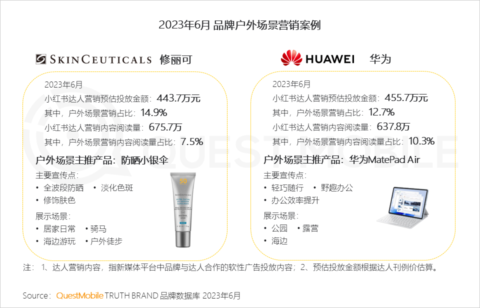 3.5 以修丽可和华为为例,修丽可通过防晒产品满足用户户外出行的【防晒】【淡斑】需求,华为则主打户外【轻巧便携】【野趣办公】,满足消费者户外便捷办公需求