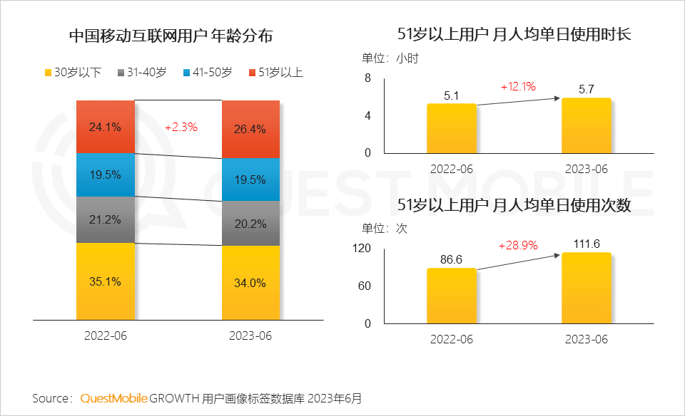 QuestMobile数据显示,截止到2023年6月份,移动互联网月活用户为12.13亿,整个上半年,用户规模增长稳定,维持在2%-2.5%之间,同时,用户粘性持续加深,月人均单日使用时长达到7.2小时,同比增长7.7%,月人均单日使用次数达到116.3次,同比增长5.4%。这背后,银发人群持续增长,51岁以上用户人群占比已经达到了26.4%,占比提升了2.3%。