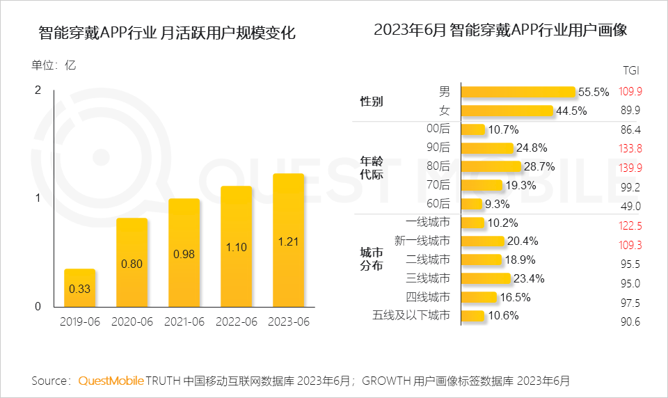 QuestMobile数据显示,智能穿戴APP行业用户男性特征明显,80后、90后为主要活跃群体,一线及新一线城市占比偏好突出。