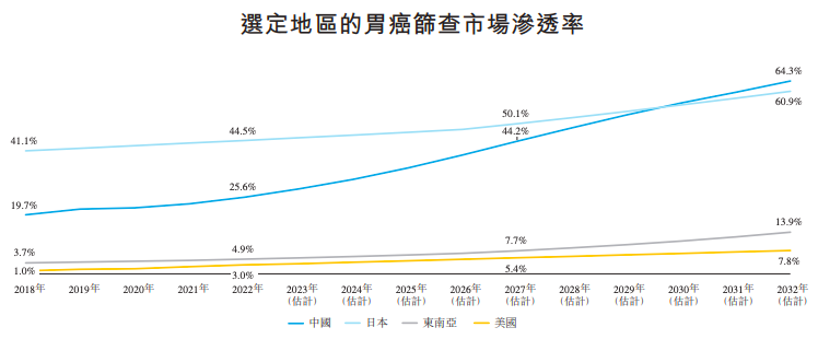 从市场渗透率来看,中国胃癌筛查市场潜力巨大,高危人群胃癌筛查渗透率由2018年的19.7%提高至2022年的25.6%,预计将于2032年大幅提高至64.3%,超越日本。