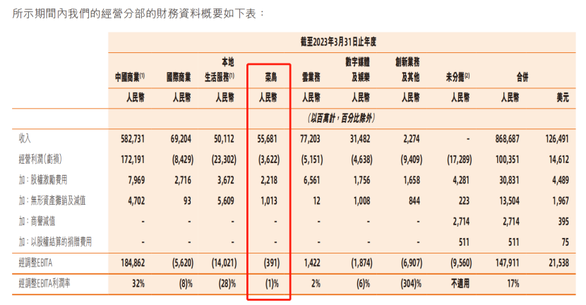 2023财年,菜鸟经营亏损占营收比例为6.5%,而2021-2022财年,该比例分别为10.64%和8.5%;经调整EBITA亏损额占营收比例为0.7%,2021-2022财年分别为2.18%和3.18%。