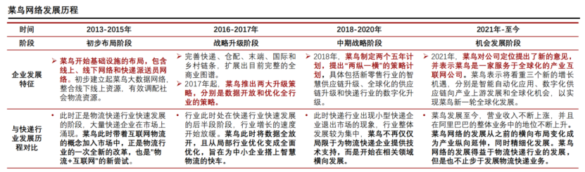 2013-2015年,刚成立的菜鸟以布局为主,包含线上、线下和快递派送员等,初步建立起菜鸟大数据网络;