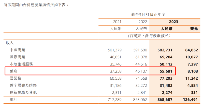 2021-2023财年,菜鸟营业收入分别为372.58亿元、461.07亿元、556.81亿元,复合增长率为22.25%;相比之下,同期阿里整体的营收复合增长率只有10.05%。